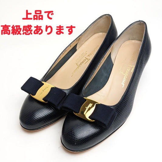 ピカピカ新品仕上⭐フェラガモ ヴァラ リザード型押しパンプス 5Cネイビー